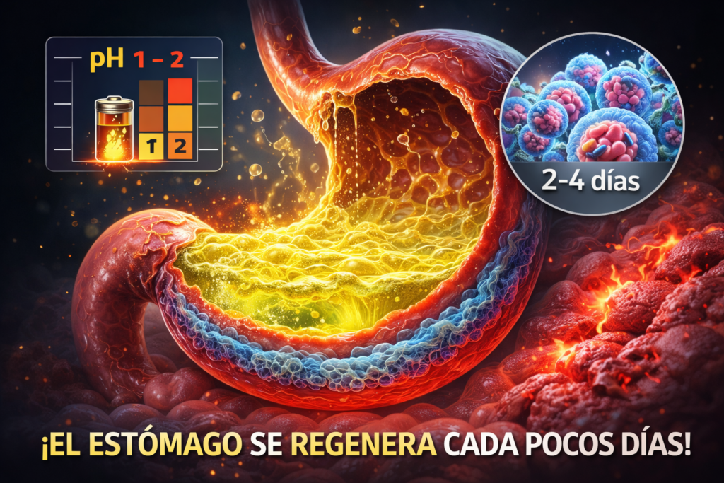 Los científicos han descubierto que las células que recubren el estómago se renuevan por completo cada 2 a 4 días. Esto ocurre porque el ácido gástrico es tan corrosivo que, sin esta renovación continua, el estómago literalmente se digeriría a sí mismo.