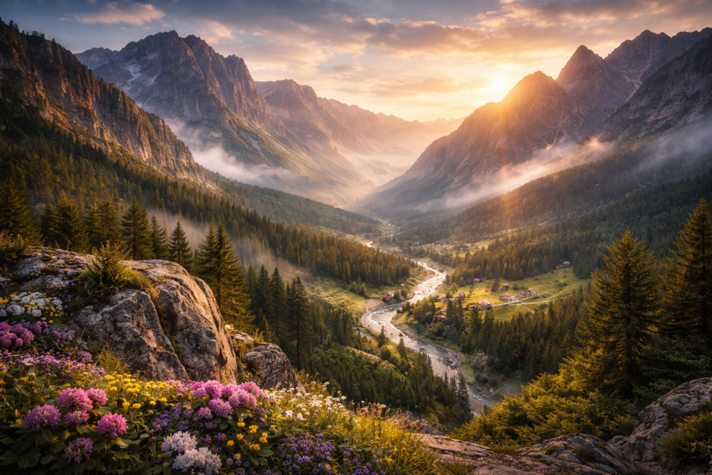 Las montañas rumanas forman parte de un vasto sistema montañoso que atraviesa el país de norte a sur, creando un mosaico de valles profundos, bosques primarios y crestas alpinas. Regiones como Transilvania, Maramureș o Brașov combinan paisajes de alta montaña con pueblos tradicionales donde el tiempo parece haberse detenido.