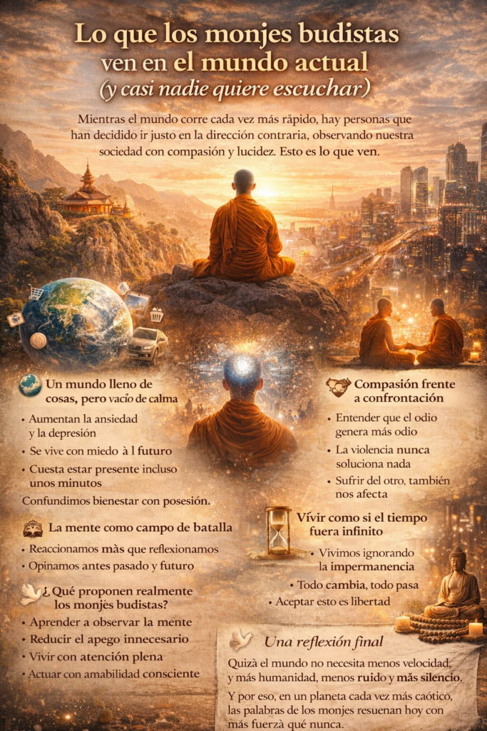 Mientras el mundo corre cada vez más rápido, hay personas que han decidido ir justo en la dirección contraria. Los monjes budistas, alejados del ruido, la prisa y la acumulación, observan nuestra sociedad con una mezcla de compasión y lucidez que incomoda… porque es difícil de rebatir.