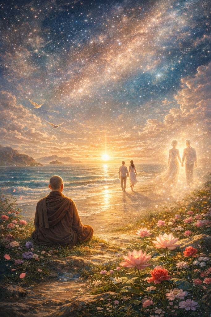 En esta contemplación, Thich Nhat Hanh nos invita a mirar más allá del cuerpo físico y de la idea tradicional de nacimiento y muerte. Según su enseñanza, el cuerpo no define lo que somos ni limita nuestra verdadera naturaleza. La vida —afirma— no tiene fronteras, ni principio ni final.